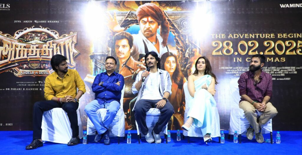 வேல்ஸ் ஃபிலிம் இன்டர்நேஷனல் சார்பில் டாக்டர் ஐசரி கே கணேஷ் மற்றும் வேம் இந்தியா சார்பில் அனீஷ் அர்ஜுன் தேவ் இணைந்து தயாரித்து, ஜீவா, அர்ஜுன், ராஷி கண்ணா நடிப்பில் பா. விஜய் இயக்கத்தில் உருவாகி, வரும் 28ம் தேதி வெளியாகும் ‘அகத்தியா’ படத்தின் பத்திரிகையாளர் சந்திப்பு சென்னையில் நடைபெற்றது. ஃபேண்டஸி ஹாரர் திரில்லர் ஜானரில் கமர்ஷியல் என்டர்டெய்னராக தயாராகி இருக்கும் ‘அகத்தியா’ திரைப்படம் பிப்ரவரி 28ம் தேதி முதல் தமிழ், தெலுங்கு, இந்தி ஆகிய இந்திய மொழிகளில் 800க்கும் மேற்பட்ட திரையரங்குகளில் வெளியாகிறது. சென்னையில் நடைபெற்ற பத்திரிகையாளர் சந்திப்பில் தயாரிப்பாளர் ஐசரி கே கணேஷ், இயக்குநர் பா.விஜய், நடிகர் ஜீவா, நடிகை ராஷி கண்ணா, ஒளிப்பதிவாளர் தீபக் குமார் பதி ஆகியோர் கலந்து கொண்டனர்.