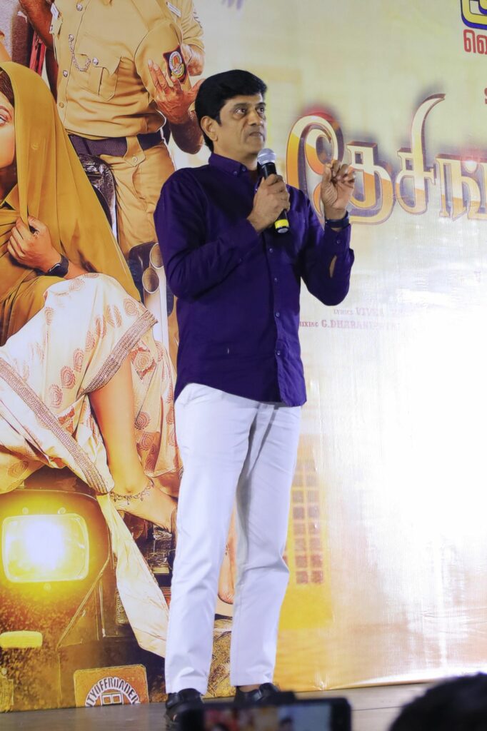 எழில் சாருக்கு இது 25வது வருடம். விமலை இப்படி வேட்டி சட்டையில் பார்க்கும்போது அவரது இயல்பிலும் சரி உடையிலும் சரி 100% விஜயகாந்த் மாதிரி தான் இருக்கிறார். இசையமைப்பாளர் வித்யாசாகர் மெலடியில் மட்டுமல்ல, எல்லாவற்றிலும் கிங். என்னை கெடுத்ததே அவர்தான். திருப்பாச்சி படத்தில் விஜய்க்கு அருமையான மெலடி பாடல் ஒன்றை உருவாக்கி அதை சொல்வதற்காக அவர் கில்லி படப்பிடிப்பில் இருந்தபோது பார்க்க சென்றிருந்தேன். அங்கே வித்யாசாகர் இசையில் அப்படி போடு போடு என்கிற பாடல் காட்சி படமாகி கொண்டிருந்தது. அதை பார்த்ததும் நம் ரூட்டை மாற்ற வேண்டும் என நினைத்து தான், மீண்டும் அந்தப் பாடலை ‘அத்த பெத்த வெத்தலை’ என்கிற குத்துபாட்டாக மாற்றினேன். என்னை குத்துப்பாட்டு இயக்குனராக மாற்றியது வித்யாசாகர் தான். அவருடைய எதிரும் புதிரும் படத்தில் இடம்பெற்ற தொட்டு தொட்டு பேசும் சுல்தானா பாடலில் கூட முதலில் சிம்ரன் நெப்போலியனும் ஆடுவதாக தான் இருந்தது. அதன் பிறகு தான் ராஜூசுந்திரம் மாஸ்டர் நடித்தார். இன்றைக்கும் அந்த பாடல் ட்ரெண்டிங்கில் இருக்கிறது. ஒரு வகையில் நானும் எழில் சாரும் எதிரும் புதிருமாகத்தான் இருக்கிறோம். நான் ஸ்கிரிப்ட் தாண்டி யாரையும் பேச விட மாட்டேன். இவர் அப்படி பேசுவதற்கு சுதந்திரம் கொடுத்திருக்கிறார் என்று எல்லோரும் பேசுவதில் இருந்து தெரிந்து கொண்டேன். இந்த படம் மிகப்பெரிய வெற்றி அடைய வாழ்த்துக்கள் என்று பேசினார்.