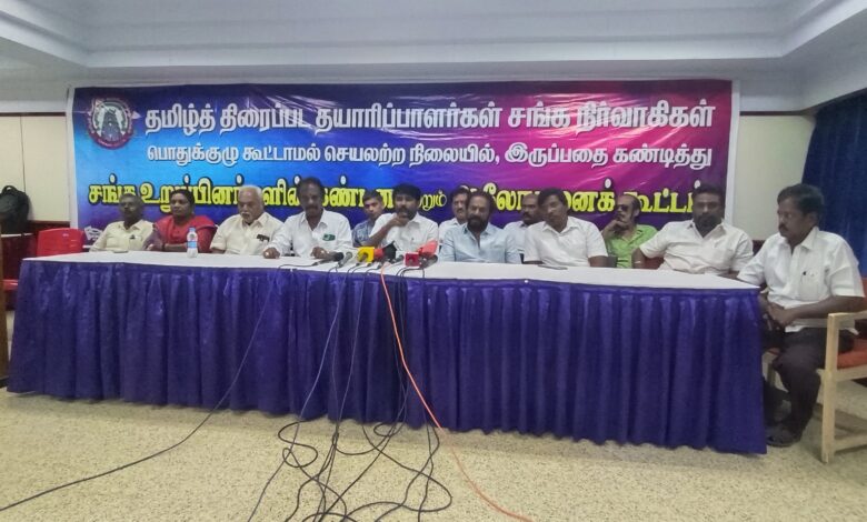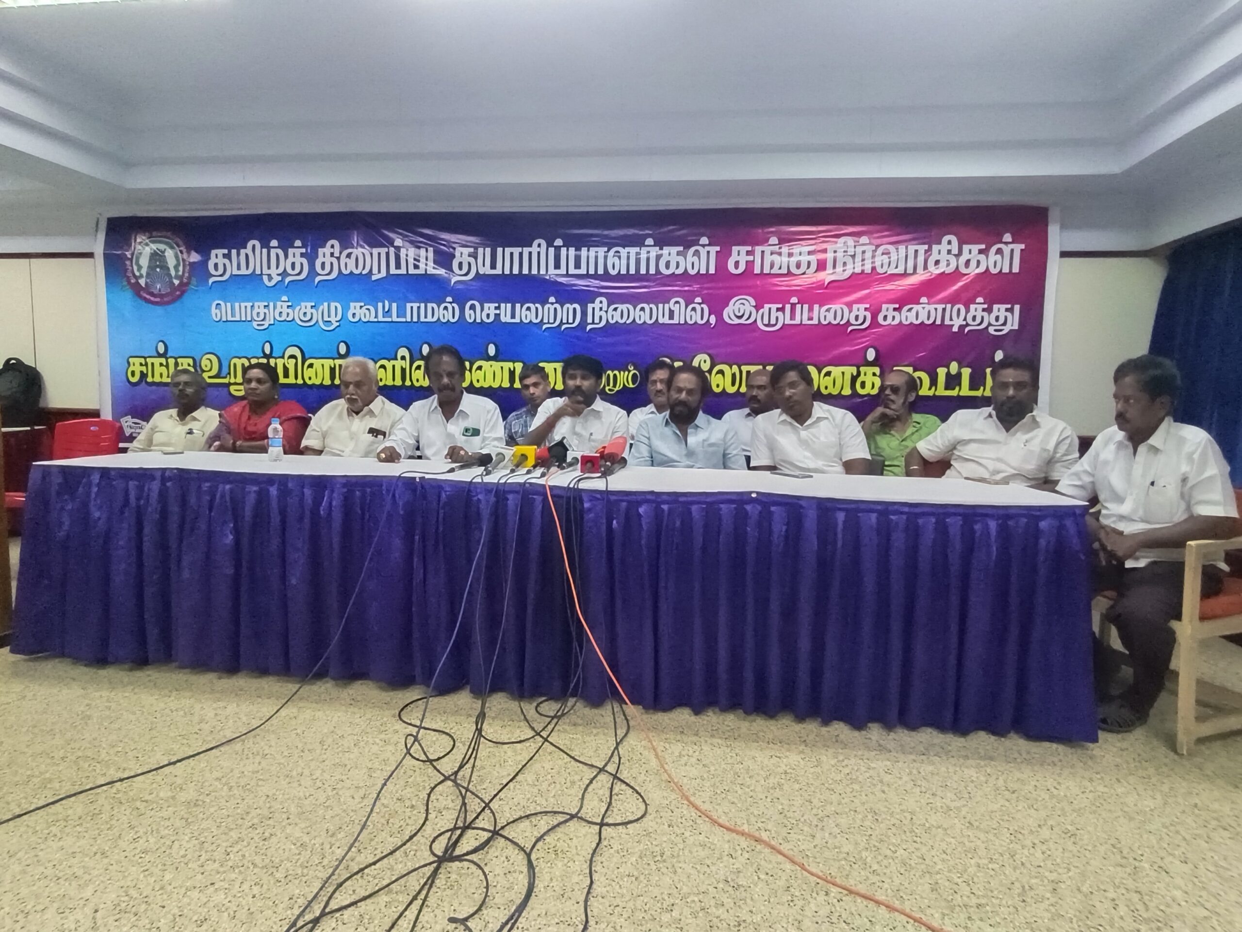 தமிழ்த் திரைப்பட தயாரிப்பாளர்கள் சங்க நிர்வாகிகள் பொதுக்குழு கூட்டாமல் செயலற்ற நிலையில், இருப்பதை கண்டித்து சங்கத்தின் உறுப்பினர்களின் கண்டனம் மற்றும் ஆலோசனை கூட்டம் தனியார் விடுதியில் நடைபெற்றது.