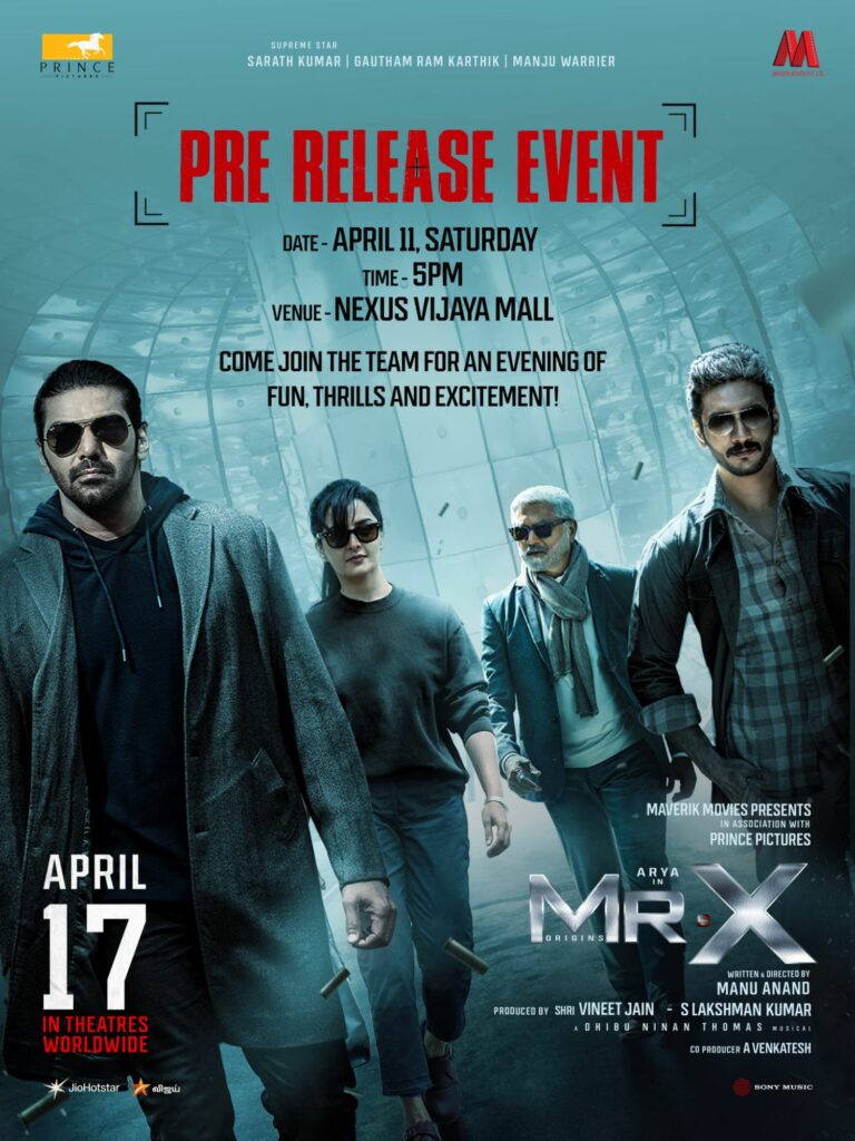 சர்தார், லப்பர் பந்து உள்ளிட்ட பல வெற்றிப்படங்களை தயாரித்த பிரின்ஸ் பிக்சர்ஸ் S. லஷ்மன்குமார், மேவரிக் மூவிஸ் வினீத் ஜெயின் உடன் இணைந்து தயாரித்துள்ள படம் ‘மிஸ்டர் எக்ஸ்’ (Mr X). இத்திரைப்படம் வரும் ஏப்-17ஆம் தேதி திரையரங்குகளில் வெளியாகிறது..