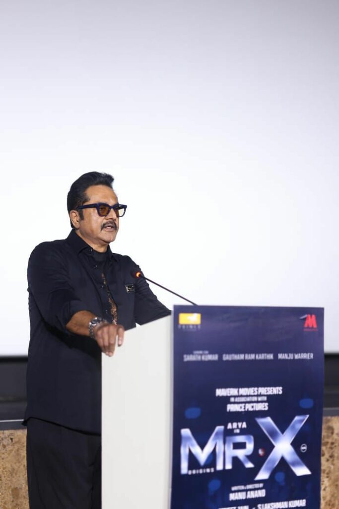 மிஸ்டர் எக்ஸ்’ படம் இப்போது அவசியமான ஒன்று. உண்மைச் சம்பவங்களை மையப்படுத்தி உருவாகியுள்ளது. இதன் கதையை மனு ஆனந்த் என்னிடம் சொன்னபோது என்னை நடிக்க வைப்பதற்காக ஏதோ ரீல் விடுகிறார் என்று நினைத்தேன். ஆனால் அவர் இதற்கான ஆராய்ச்சி பேப்பர்களை பக்காவாக வைத்திருந்தார். அதில் இரண்டு மூன்று பக்கங்களை பார்த்ததுமே அவர் மிகப்பெரிய உழைப்பைக் கொடுத்திருக்கிறார் என்று தெரிந்தது. உடனே இதில் நடிக்க ஒப்புக் கொண்டேன். மிஸ்டர் எக்ஸ் என்னுடைய 172 வது படம். இத்தனை வருடங்களில் தாத்தா வேடம் உட்பட பல கதாபாத்திரங்களில் நடித்தாலும் இதில் ஒரு வித்தியாசமான கதாபாத்திரம். எனக்கு வெள்ளை முடி, வெள்ளைத் தாடியைக் கொடுத்து இயக்குநர் தன் ஆசையைத் தீர்த்துக் கொண்டார். 2023ல் இந்தப் படத்தைத் தொடங்கினாலும் இதை மிகுந்த சிரத்தையுடன் பொறுமையாக கொண்டு வந்ததற்கு மனு ஆனந்த்தைப் பாராட்ட வேண்டும். தங்களது கதாபாத்திரங்களுக்காக ஆர்யா, கௌதம் ராம் கார்த்திக் இருவருமே மிகுந்த அளவு மெனக்கெடலை தந்திருக்கிறார்கள். கௌதம் இந்த படத்தில் வித்தியாசமாகத் தெரிவார். படத்தில் எங்கள் அனைவரையும் இயக்கியிருப்பதால் மஞ்சு வாரியரை மேம் என்று சொல்வது தான் சரியாக இருக்கும். போரில் பங்கேற்கும் வீரர்களுக்கு பரம்வீர் சக்ரா உள்ளிட்ட உரிய கௌரவங்கள் கிடைக்கின்றன. நமது நாட்டைப் பாதுகாப்பதற்காக வெளிநாடுகளில் தங்கியிருந்து உளவாளிகளாக வேலை செய்வது யாருக்கும் வெளியே தெரியாது. அதை வெளியே சொல்லவும் முடியாது. தன் மனைவிக்குக் கூட நான் யார் என்று உண்மையைச் சொல்ல முடியாது. அப்படிப்பட்ட முகம் வெளியில் தெரியாத ஹீரோக்களை நாம் பாராட்ட வேண்டும் என்றால் இது போன்ற படங்களை எடுத்து தான் பாராட்ட முடியும்.. பிரம்மாண்ட பட்ஜெட்டில் இந்தப் படத்தை எடுப்பதற்கு இயக்குநர் மனு ஆனந்திற்கு உதவியாக இருந்த தயாரிப்பாளர்களுக்கு என்னுடைய பாராட்டை தெரிவித்துக் கொள்கிறேன். அதை பட்டை தீட்டுவதற்காக இந்த கால அவகாசம் தேவைப்பட்டது.. இந்த சமயத்தில் தான் துரந்தர் வெளியாகி சரித்திரம் படைத்தது. இதுபோன்ற படங்கள் வரவேண்டும் என நினைப்பவர்களுக்கு இந்த படம் ஒரு வரப்பிரசாதமாக இருக்கும். இந்த படங்களை திரையரங்குகளில் பார்த்து ரசித்தால் நல்ல அனுபவம் கிடைக்கும். படம் பார்த்து எனக்கே ஜேம்ஸ்பாண்ட் படம் பார்த்தது போன்ற உணர்வு ஏற்பட்டது என்றால் சாதாரண ரசிகனுக்கு எந்த அளவிற்கு அனுபவமாக இருக்கும் எனச் சொல்லத் தேவை இல்லை. படம் வெளியாகி 50 நாட்களுக்குப் பிறகு ஓடிடி தளத்தில் வெளியானால் ரசிகர்கள் அதிகமாக திரையரங்குக்கு செல்வார்கள் என்று கூறினார்.